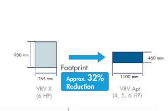 - VRV Apt has significant reduction in height (870mm only) thanks to 1 fan design. Now, the height including the frame for installation has been realized to be 1 m or lower, enabling installation of outdoor units without damaging scenery.